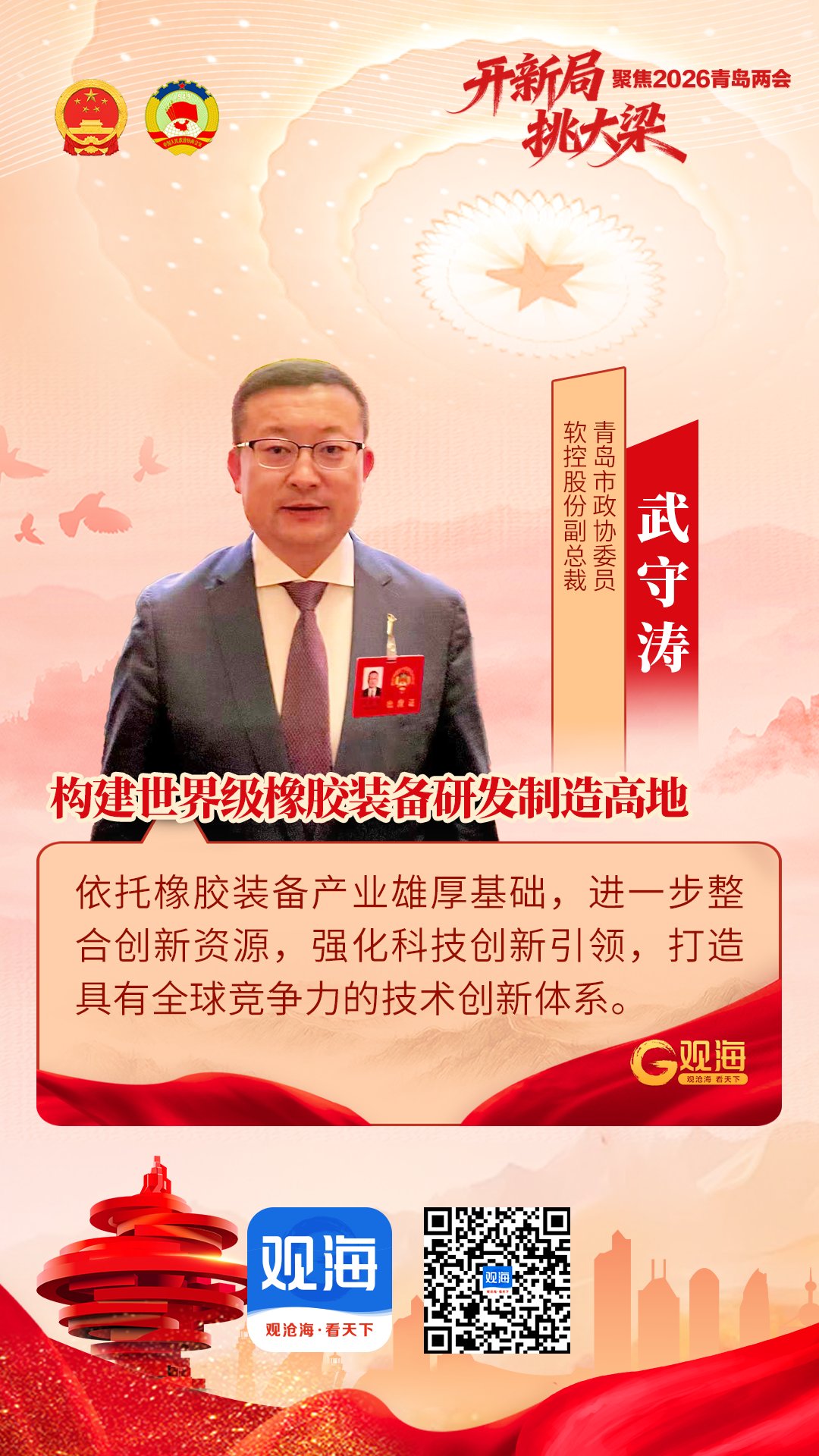 青島是我國橡膠工業的重要發源地,橡膠裝備(bèi)制造業基礎雄厚、産業鏈條完整,聚集瞭(le)多家國家級制造業單項冠軍和專精特新“小巨人”企業,技術水平和市場占有率國内領先。面對部分高端部件、系統集成能力有待突破,以及企業出海過程中遇到的國際标準對接、服務網絡布局等現實挑戰,青島市政協委員、軟控股份有限公司副總裁武守濤提交專項提案,建議以科技創新驅動産業升級,以系統化支撐開拓全球市場,爲青島打造世界級橡膠裝備(bèi)産業集群提供路徑指引。
