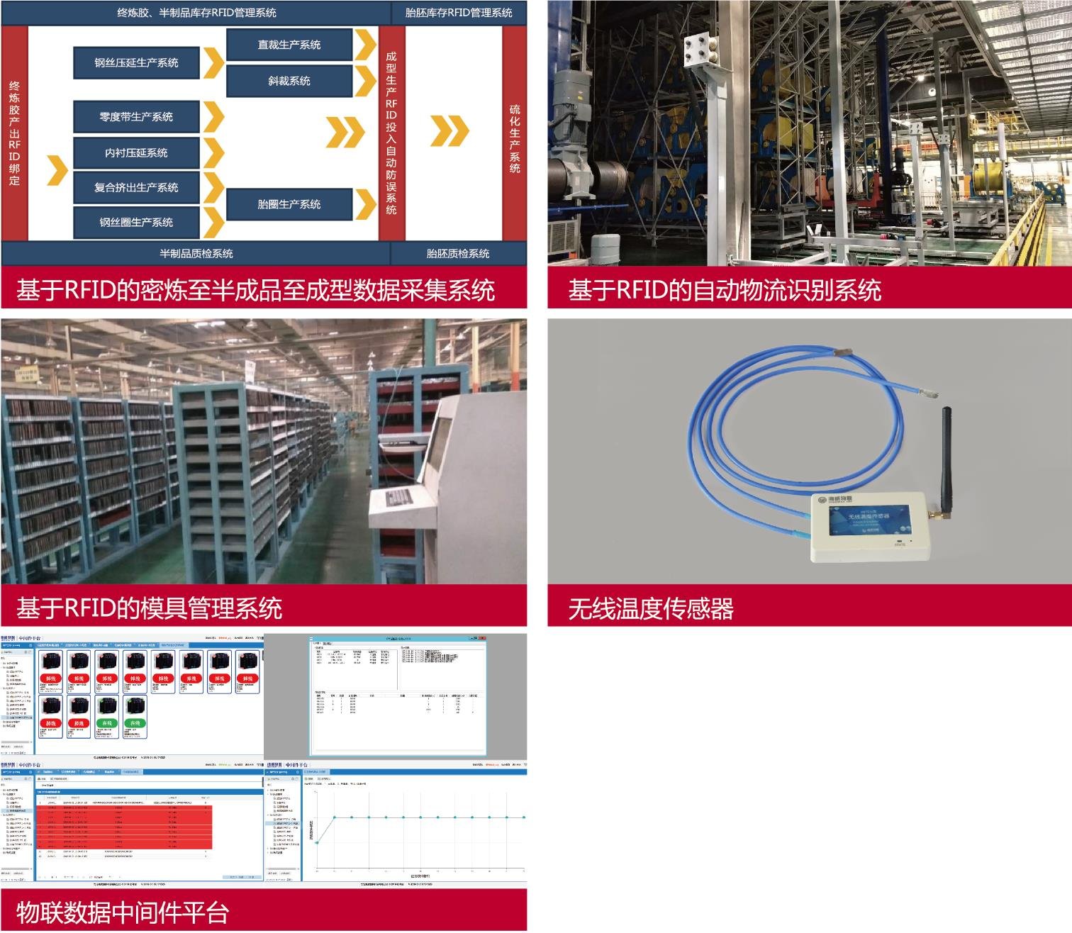 基於(yú)RFID的輪胎生産信息採(cǎi)集管控系統以RFID自動識别技術爲主,集成各種物聯網技術,實現輪胎生産過程中的工藝信息採(cǎi)集控制、物料信息採(cǎi)集控制、倉儲運輸信息採(cǎi)集控制等功能。包括基於(yú)RFID的密煉至半成品至成型數據採(cǎi)集系統、基於(yú)RFID的自動物流識别系統、基於(yú)RFID的模具管理系統、EPD、物聯網平台等主要産品。